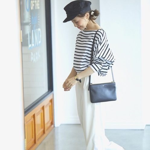 ずっと流行っているマリンキャップ。フレンチカジュアルがトレンドの今、ハットより、ニット帽より旬のコーデに見えるのが人気の理由です。大人的にはハンチングよりぺったんこではなく、キャスケットより丸くない形がオススメ!