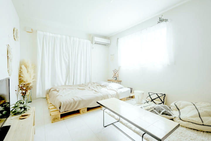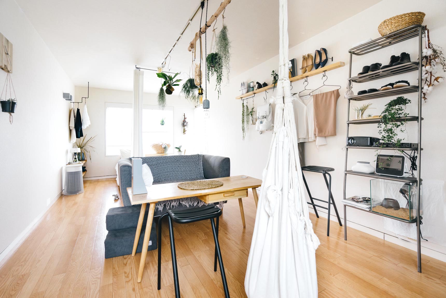 リラックスできる空間にしたいなら、光や風を感じることのできるリゾートインテリアがおすすめ。 家具や雑貨の色味を抑えて、植物を取り入れることで、居心地の良い空間を実現している1Kのお部屋を訪ねました。