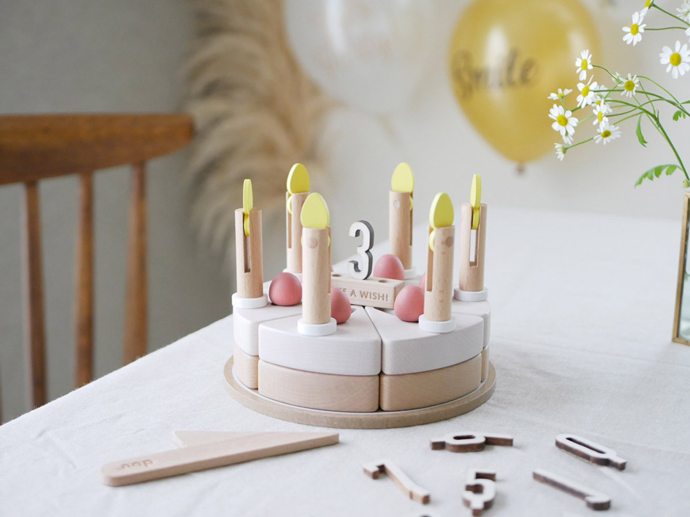 おいしそうなケーキにろうそくをたて、木のナイフで1切に分けたりとバースデーケーキをモチーフにした、木のおもちゃ「make a wish」。”ふぅー”と息を吹きかけると本物のろうそくのように火を消せる仕様なんです♪