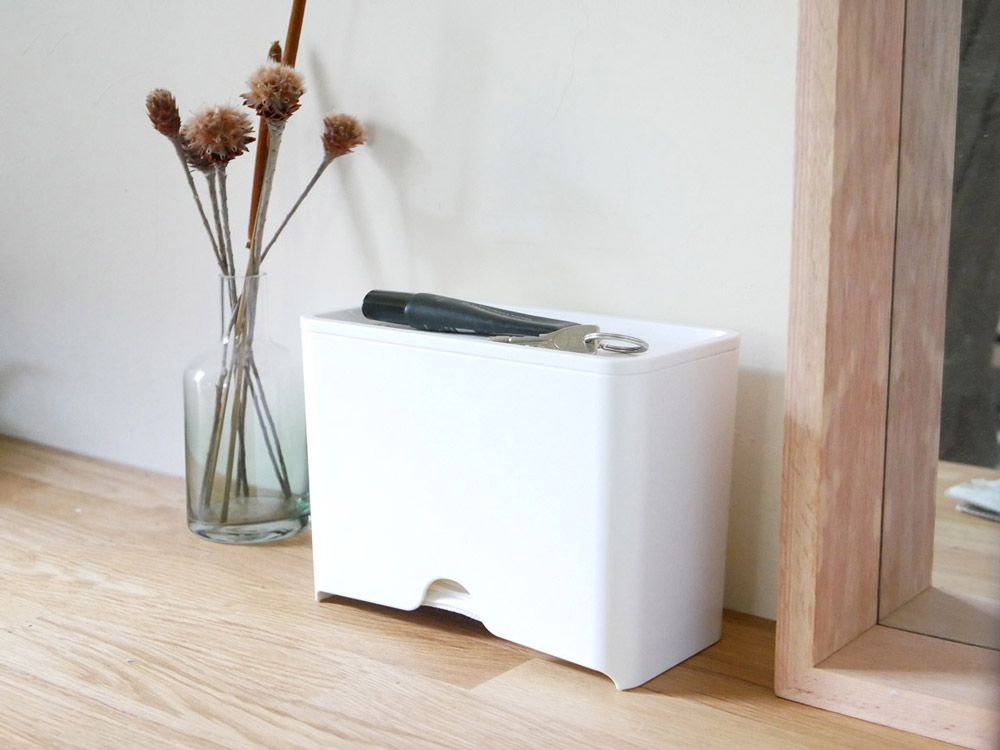 人気のマスクディスペンサーから、天面がトレイとして使えるもっと便利な「NEWマスクディスペンサー」の登場です。トレイには鍵や印鑑、体温計など必要な物をまとめて置ける、暮らしにとけこむマスクの収納ケースです。