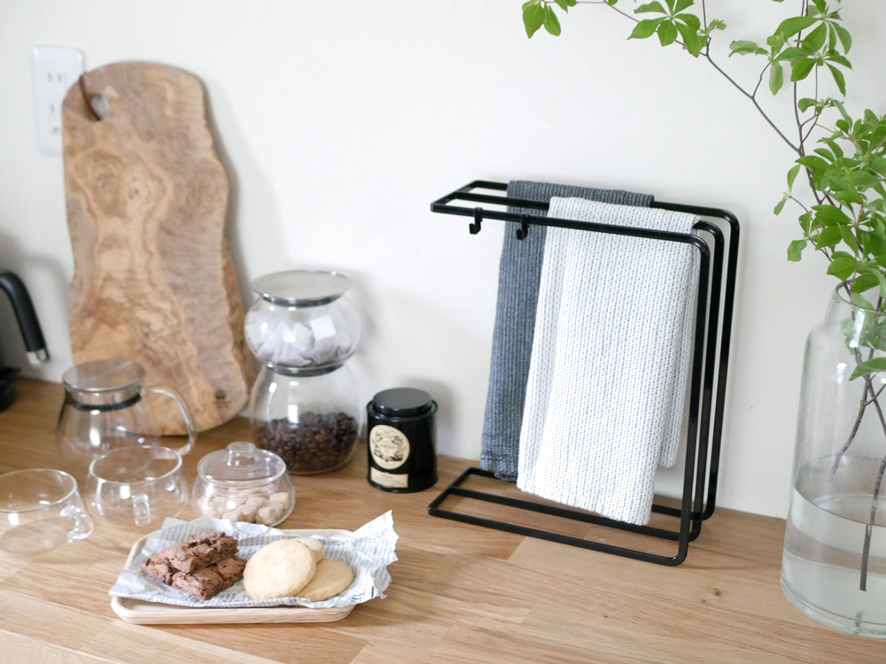 掛ける物の長さで縦置きも横置きもできるスタイリッシュな3枚掛けの布巾ハンガー。フック付きで小物も干せて、ちょっとした隙間にゴム手袋やトレイも掛けておける万能品です。