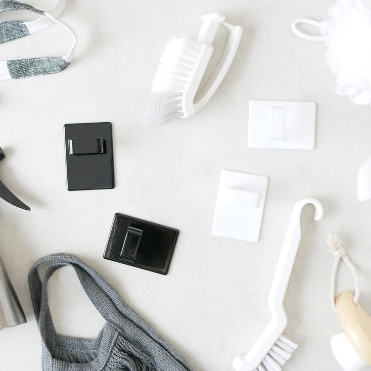 置き場所に困りがちなスプレーや洗濯用ハンガーをスマートに収納できる万能フックです。