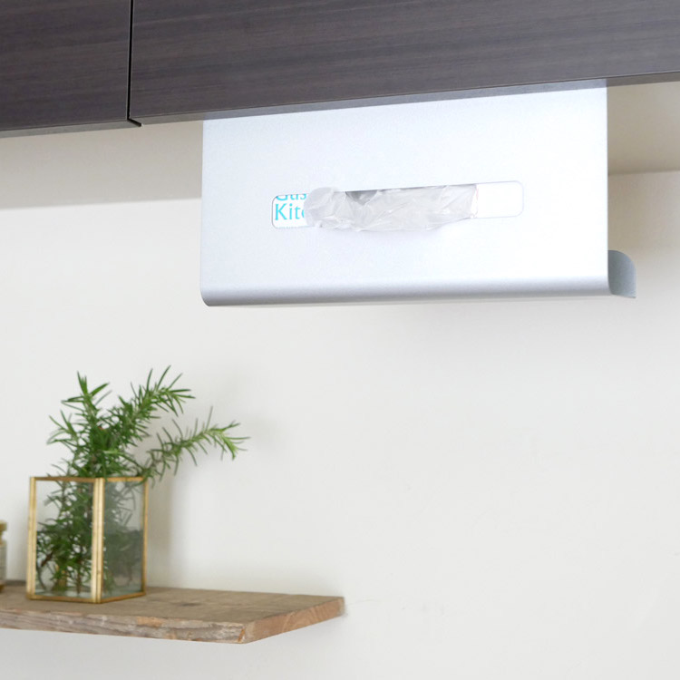 吊戸棚下のデッドスペースに箱型キッチンペーパー、保存袋、ラップ・アルミホイルケースの収納をスマートに収納できる「キッチンボックスハンガー」です。