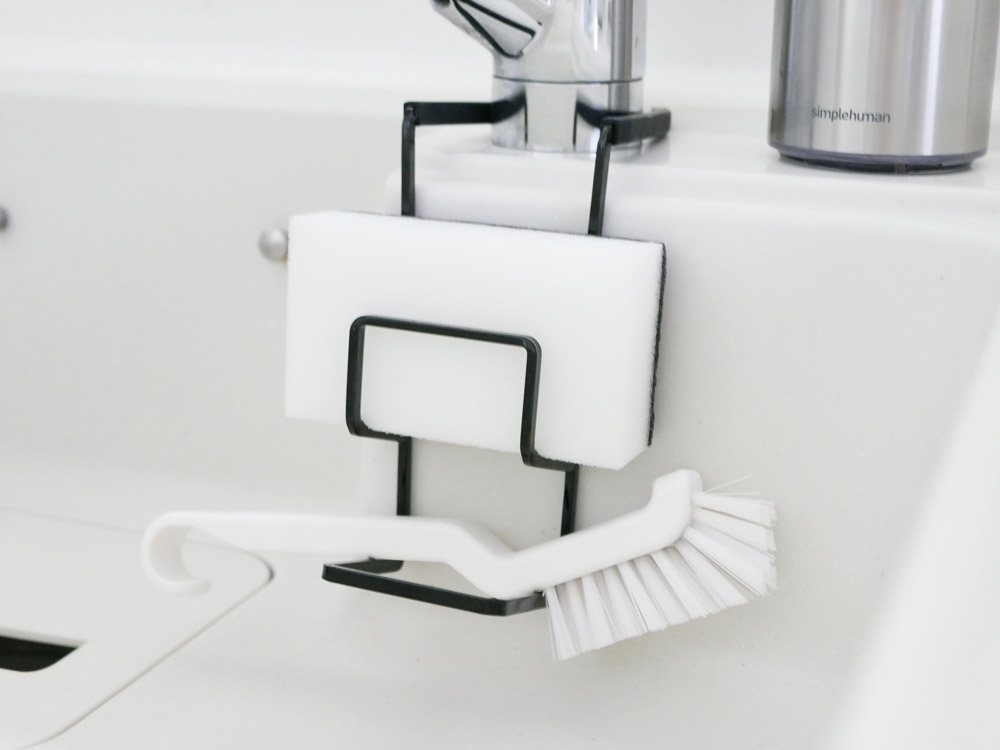蛇口を挟み込むだけの簡単取り付けで、しっかりとホールド。水はけ抜群の新しいスポンジホルダーです。 備え付けのスポンジラックだと大きすぎる、吸盤だと汚れが見える・・・ちょっとなぁ。と少し気になっていた方に、こんなシンプルな形状が即解決してくれます!
