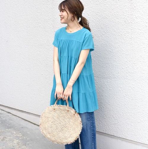 暑い夏は肌見せを意識した服が多いですよね。露出が増えると気になるのが体のラインです。なるべく体型カバーしたい方はシルエットを隠せるチュニックがおすすめですよ。長めの丈で腰回りをカバーできちゃいますよ。