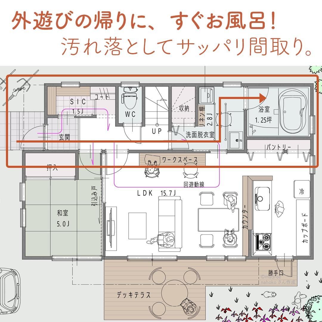 madree(マドリー)は、建築家さんの間取りを含むあなただけの家づくりマイホームプランをご提案しています。今回は「外遊びの帰りに、すぐお風呂!汚れ落としてサッパリ間取り。」をご紹介します。
