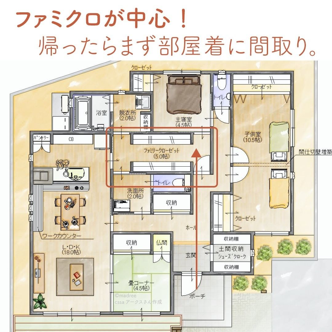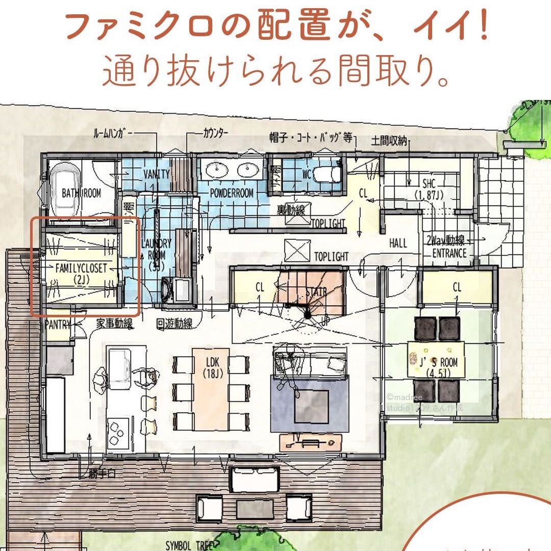 madree(マドリー)は、建築家さんの間取りを含むあなただけの家づくりマイホームプランをご提案しています。今回は「ファミクロの配置が、イイ!通り抜けられる間取り。」をご紹介します。
