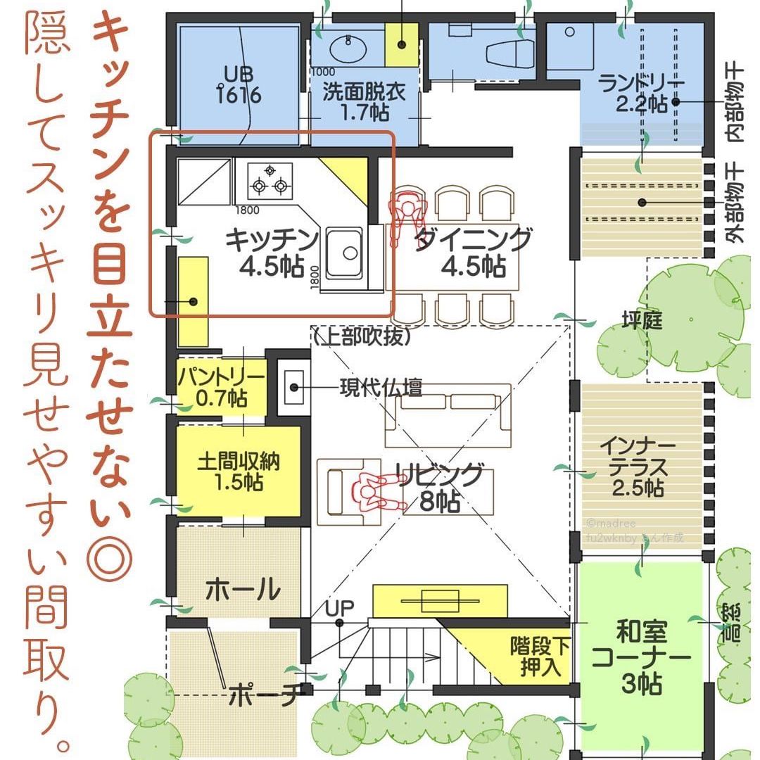 madree(マドリー)は、建築家さんの間取りを含むあなただけの家づくりマイホームプランをご提案しています。今回は「キッチンを目立たせない◎隠してスッキリ見せやすい間取り。」をご紹介します。
