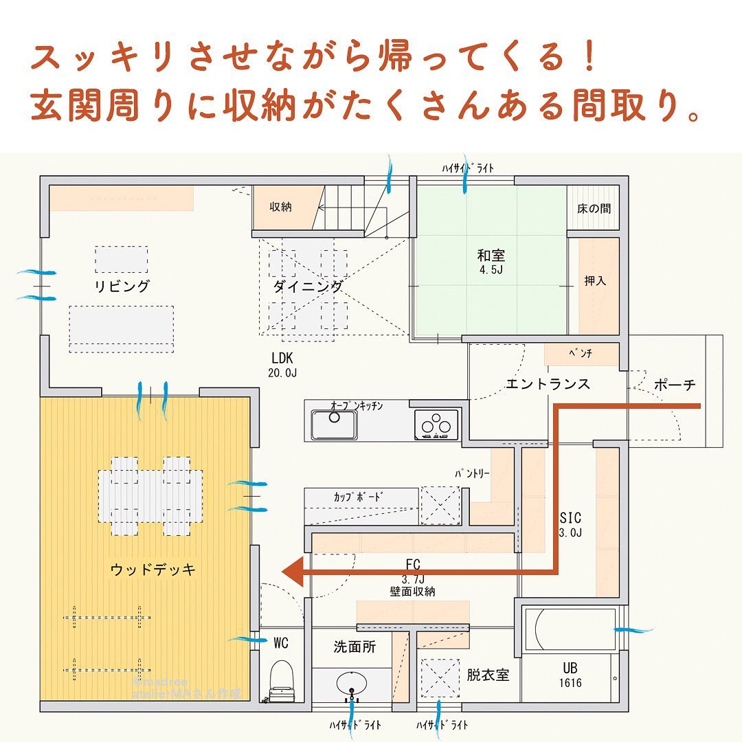 madree(マドリー)は、建築家さんの間取りを含むあなただけの家づくりマイホームプランをご提案しています。今回は「スッキリさせながら帰ってくる!玄関周りに収納がたくさんある間取り。」をご紹介します。