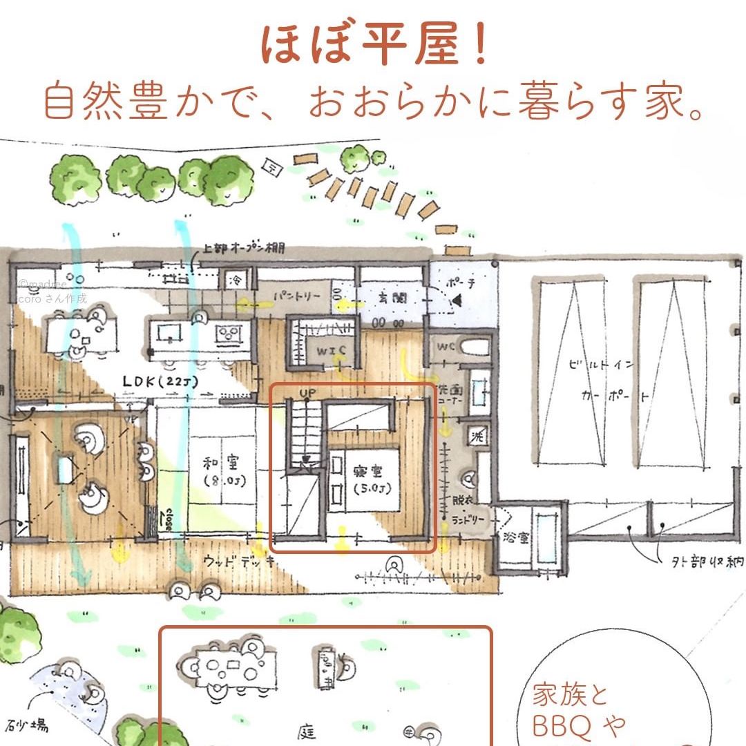 madree(マドリー)は、建築家さんの間取りを含むあなただけの家づくりマイホームプランをご提案しています。今回は「ほぼ平屋!自然豊かで、おおらかに暮らす家。」をご紹介します。