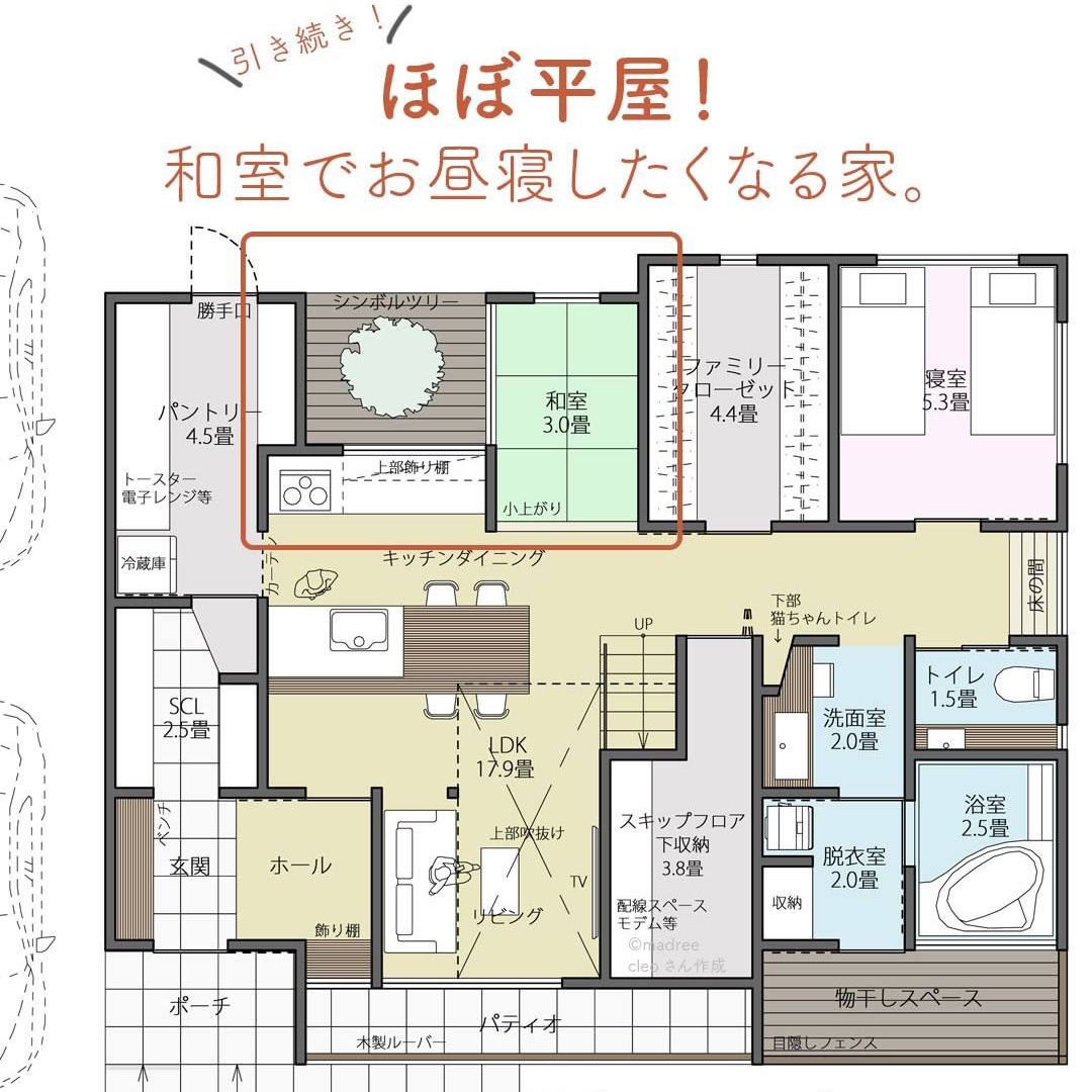 madree(マドリー)は、建築家さんの間取りを含むあなただけの家づくりマイホームプランをご提案しています。今回は「ほぼ平屋!和室でお昼寝したくなる家。」をご紹介します。