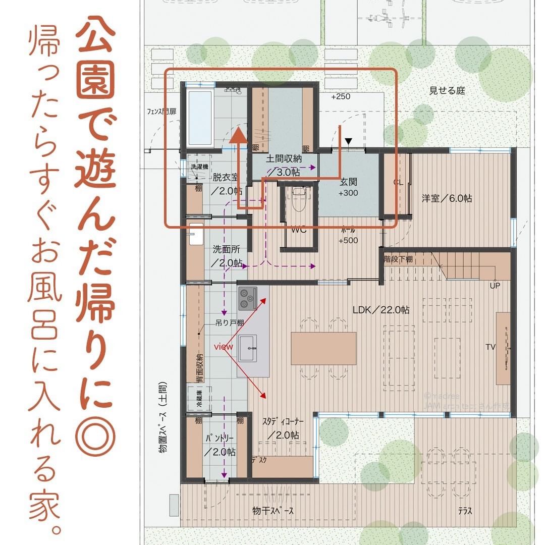 madree(マドリー)は、建築家さんの間取りを含むあなただけの家づくりマイホームプランをご提案しています。今回は「公園で遊んだ帰りに◎帰ったらすぐお風呂に入れる家。」をご紹介します。