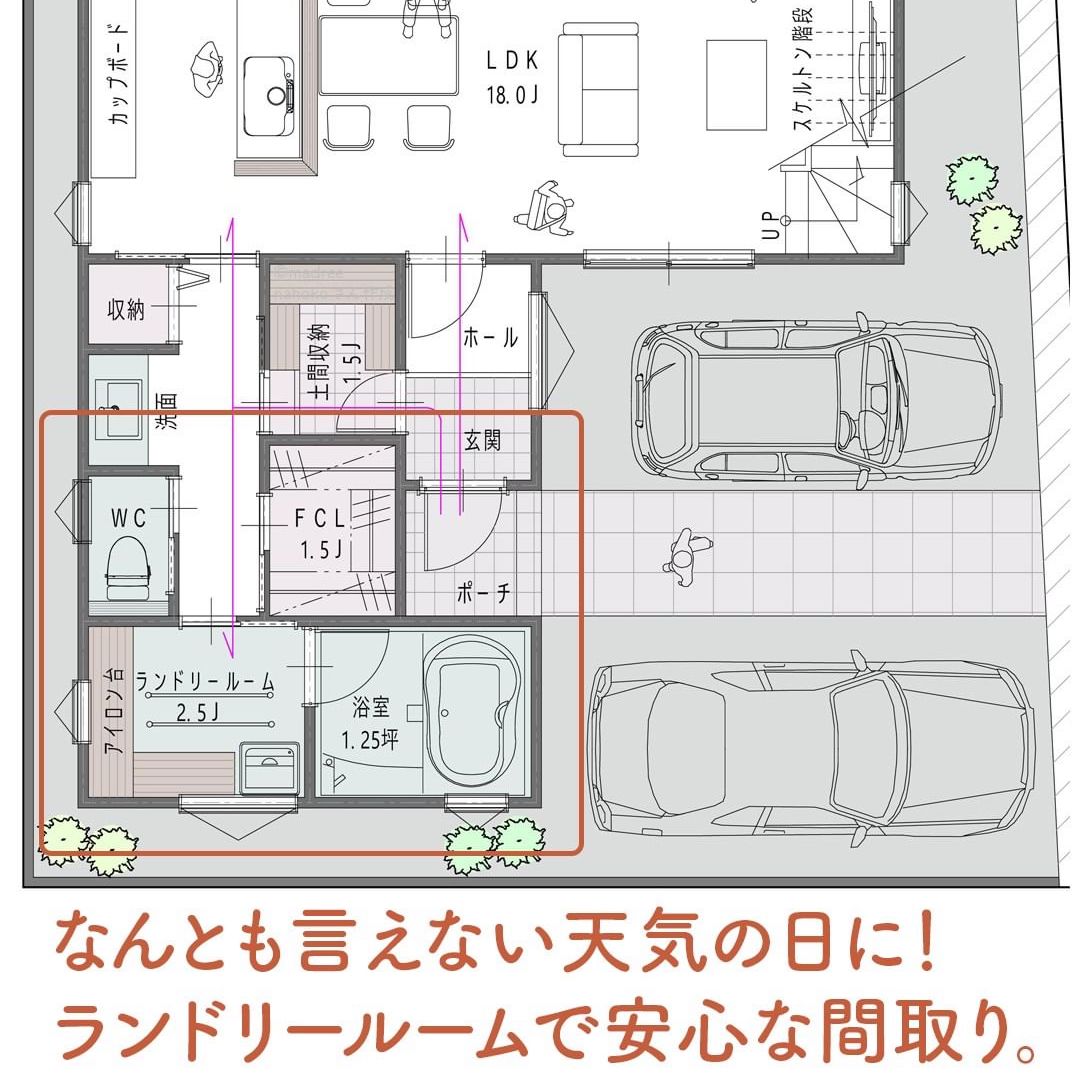 madree(マドリー)は、建築家さんの間取りを含むあなただけの家づくりマイホームプランをご提案しています。今回は「なんとも言えない天気の日に!ランドリールームで安心な間取り。」をご紹介します。