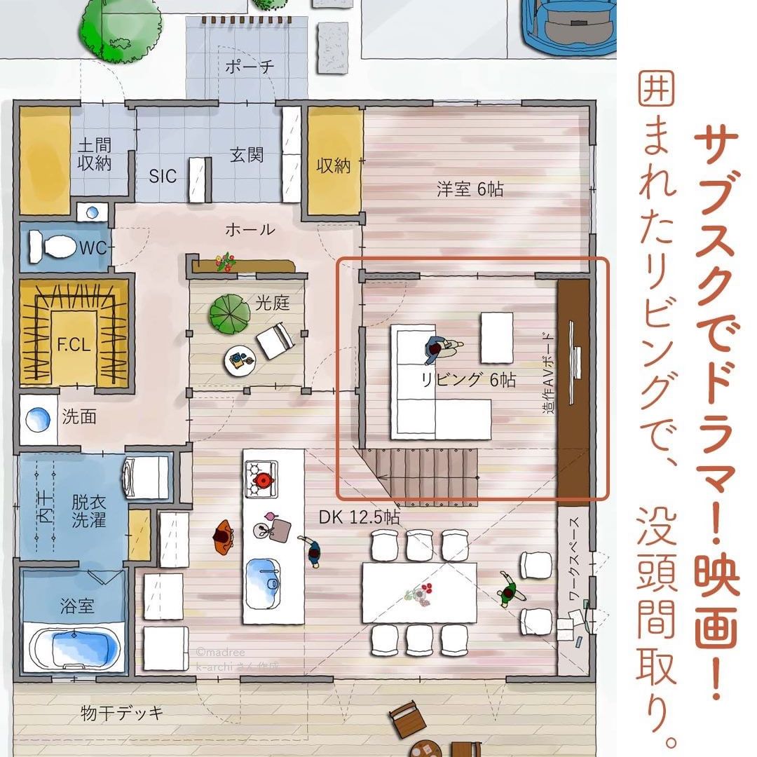 madree(マドリー)は、建築家さんの間取りを含むあなただけの家づくりマイホームプランをご提案しています。今回は「サブスクでドラマ!映画!囲まれたリビングで、没頭間取り。」をご紹介します。