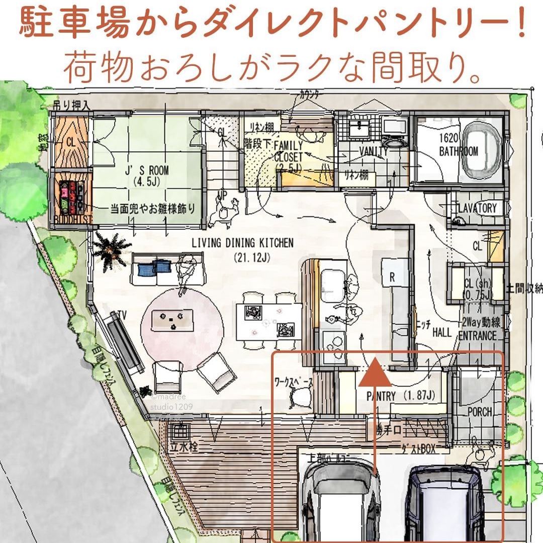 madree(マドリー)は、建築家さんの間取りを含むあなただけの家づくりマイホームプランをご提案しています。今回は「駐車場からダイレクトパントリー!荷物下ろしがラクな間取り。」をご紹介します。