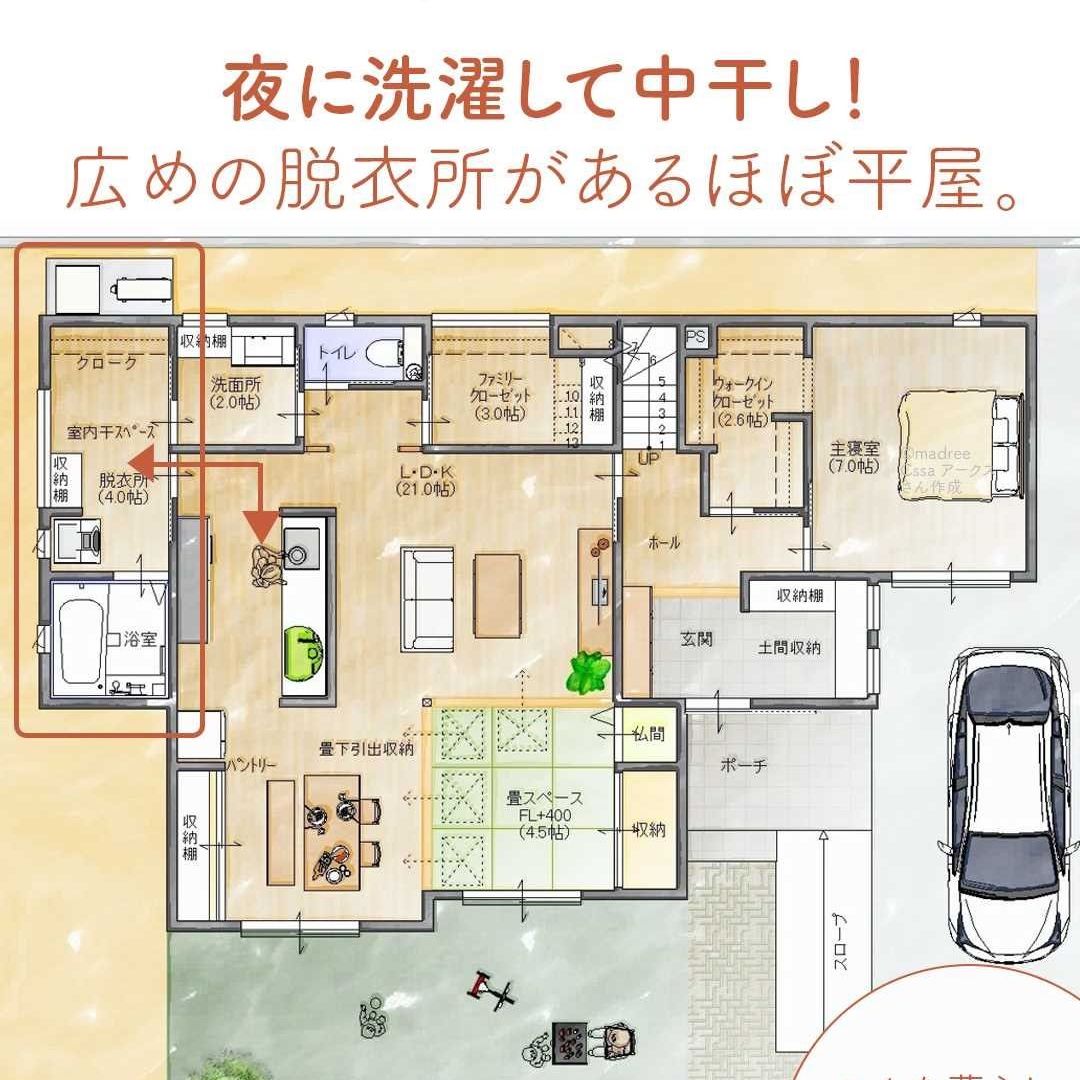 madree(マドリー)は、建築家さんの間取りを含むあなただけの家づくりマイホームプランをご提案しています。今回は「夜に洗濯して中干し!広めの脱衣所があるほぼ平屋。」をご紹介します。