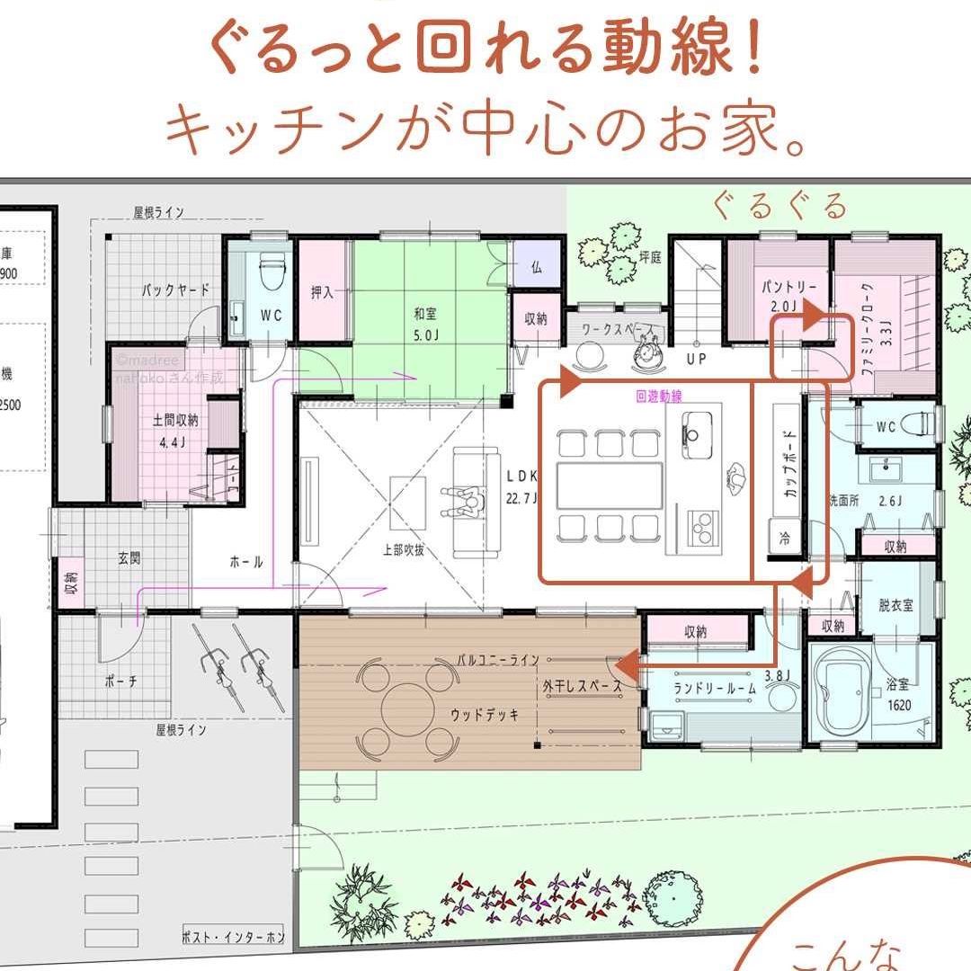 madree(マドリー)は、建築家さんの間取りを含むあなただけの家づくりマイホームプランをご提案しています。今回は「ぐるっと回れる動線!キッチンが中心のお家。」をご紹介します。