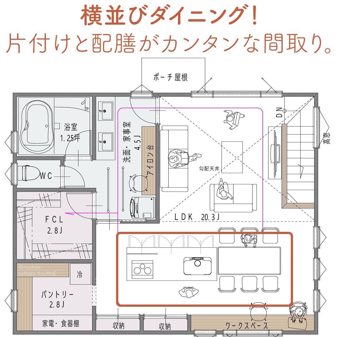 madree(マドリー)は、建築家さんの間取りを含むあなただけの家づくりマイホームプランをご提案しています。今回は「横並びダイニング!片付けと配膳がカンタンな間取り。」をご紹介します。