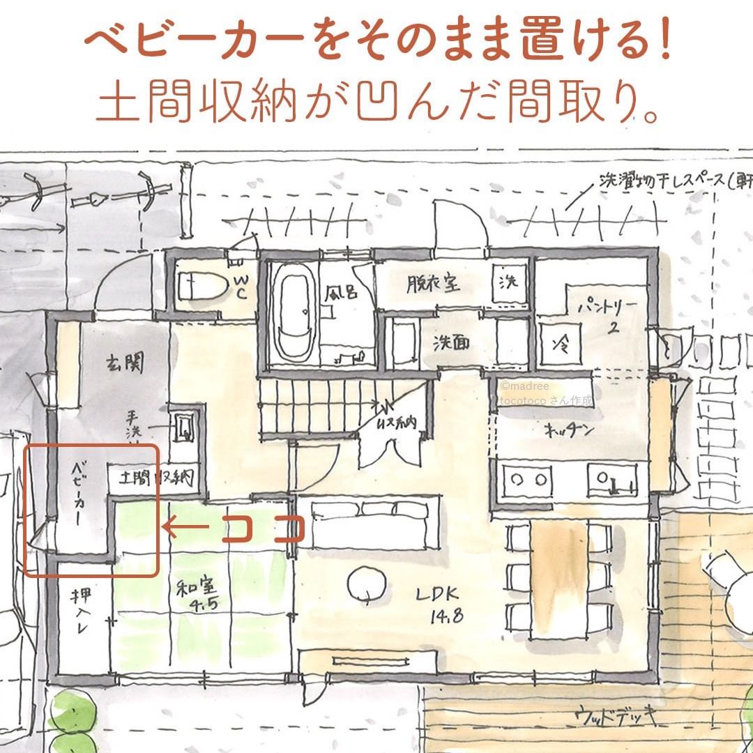 madree(マドリー)は、建築家さんの間取りを含むあなただけの家づくりマイホームプランをご提案しています。今回は「ベビーカーをそのまま置ける!土間収納が凹んだ間取り。 」をご紹介します。