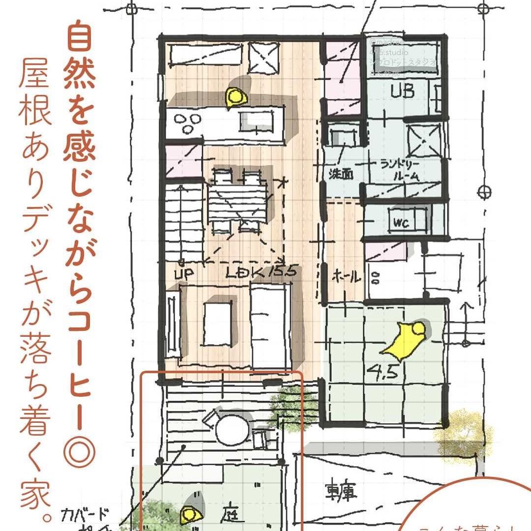 madree(マドリー)は、建築家さんの間取りを含むあなただけの家づくりマイホームプランをご提案しています。今回は「自然を感じながらコーヒー◎屋根ありデッキが落ち着く家。」をご紹介します。