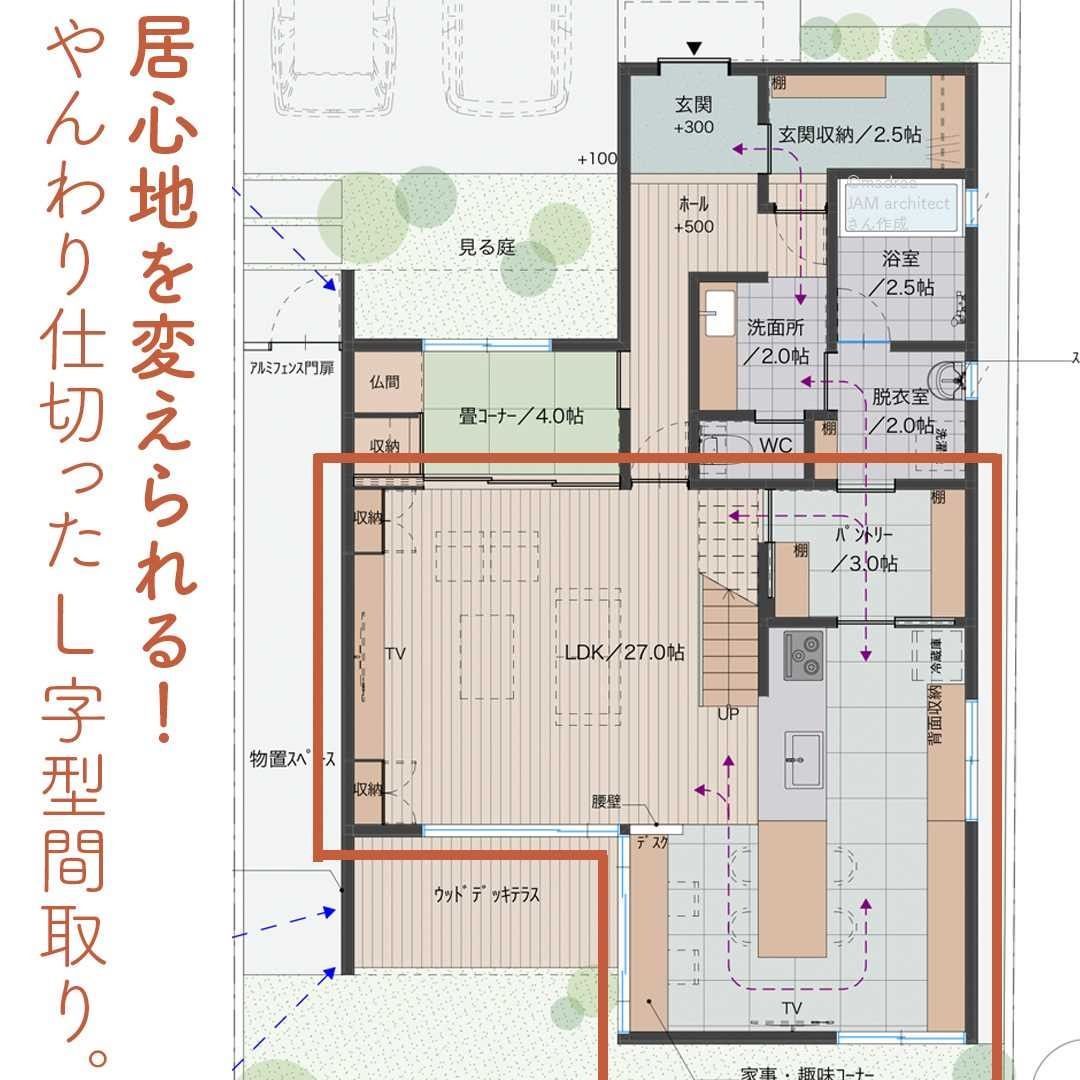 madree(マドリー)は、建築家さんの間取りを含むあなただけの家づくりマイホームプランをご提案しています。今回は「居心地を変えられる!やんわり仕切ったL字型間取り。」をご紹介します。