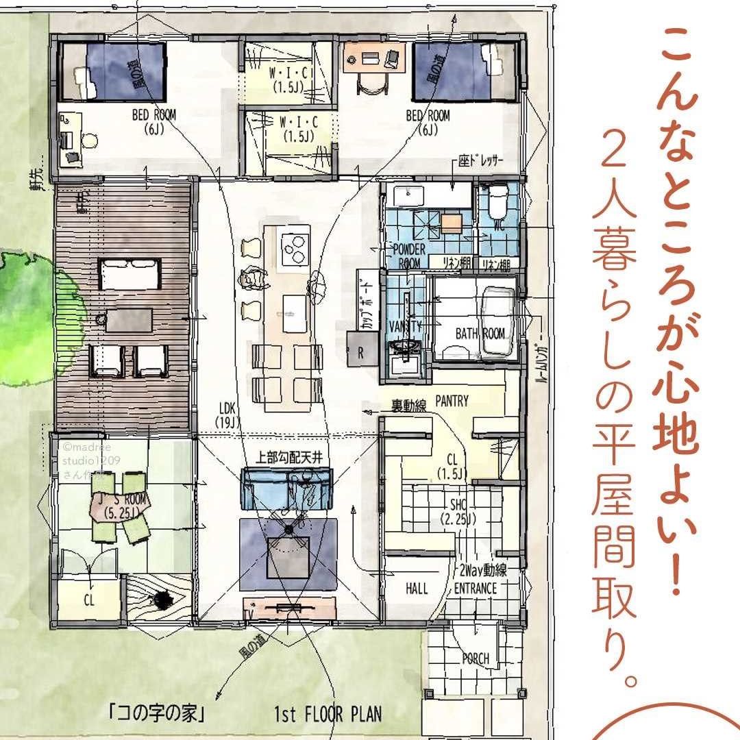 madree(マドリー)は、建築家さんの間取りを含むあなただけの家づくりマイホームプランをご提案しています。今回は「こんなところが心地よい!2人暮らしの平屋間取り。」をご紹介します。