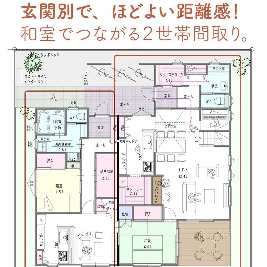 madree(マドリー)は、建築家さんの間取りを含むあなただけの家づくりマイホームプランをご提案しています。今回は「玄関別で、ほどよい距離感!和室でつながる2世帯間取り。」をご紹介します。