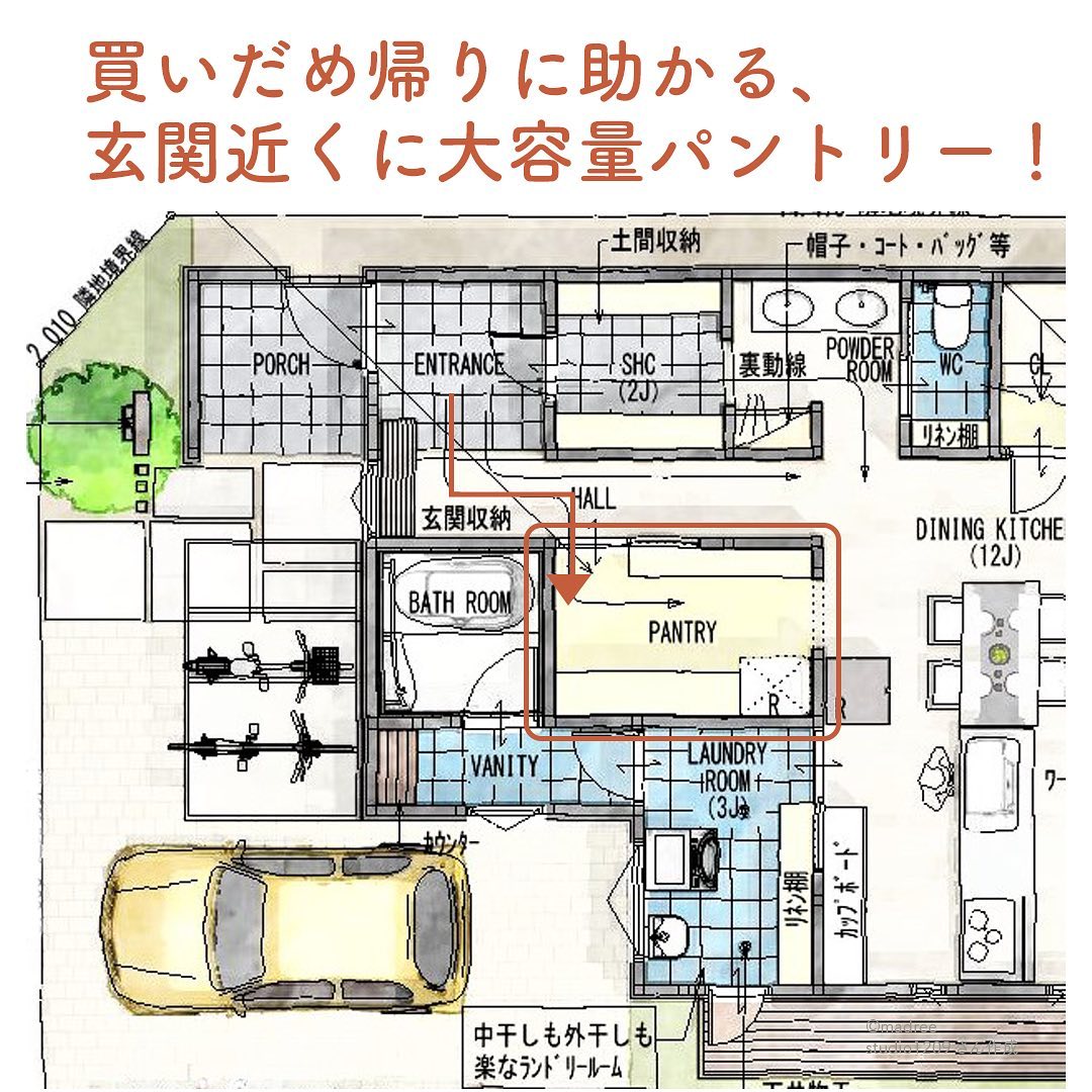 madree(マドリー)は、建築家さんの間取りを含むあなただけの家づくりマイホームプランをご提案しています。今回は「買いだめ帰りに助かる、玄関近くに大容量パントリー!」をご紹介します。