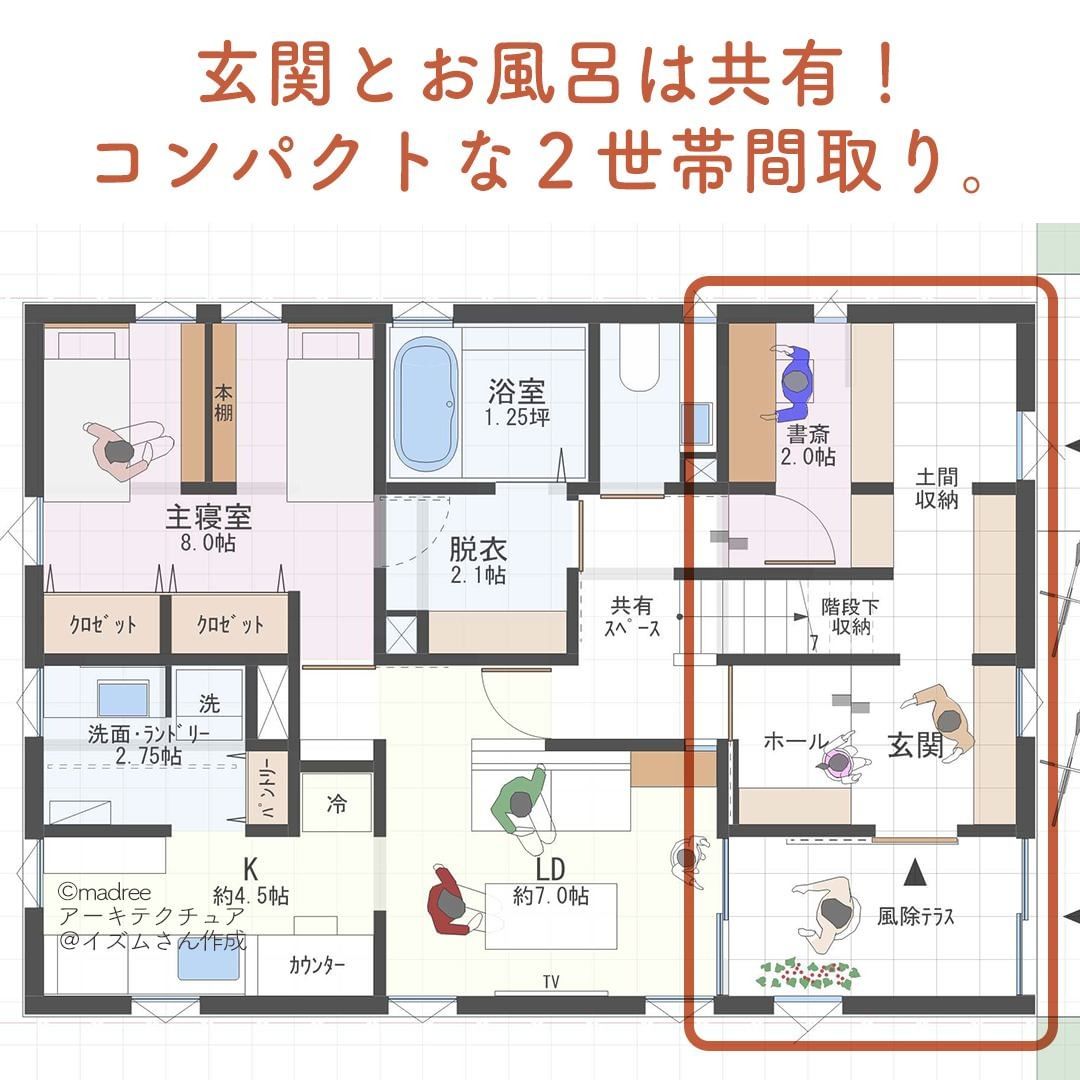 madree(マドリー)は、建築家さんの間取りを含むあなただけの家づくりマイホームプランをご提案しています。今回は「玄関とお風呂は共有!コンパクトな2世帯間取り。」をご紹介します。