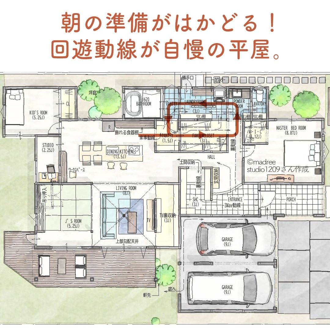 madree(マドリー)は、建築家さんの間取りを含むあなただけの家づくりマイホームプランをご提案しています。今回は「2つの家事動線が便利!家事の時短がかなう間取り。」をご紹介します。