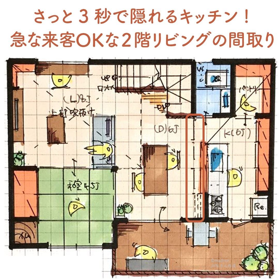 madree(マドリー)は、建築家さんの間取りを含むあなただけの家づくりマイホームプランをご提案しています。今回は「さっと3秒で隠れるキッチン!急な来客OKな2階リビングの間取り」をご紹介します。