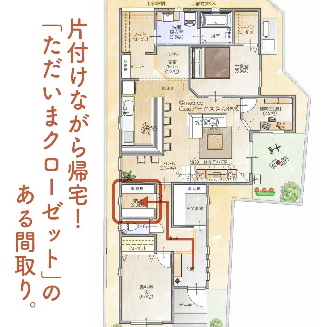 madree(マドリー)は、建築家さんの間取りを含むあなただけの家づくりマイホームプランをご提案しています。今回は「片付けながら帰宅!「ただいまクローゼット」のある間取り。」をご紹介します。