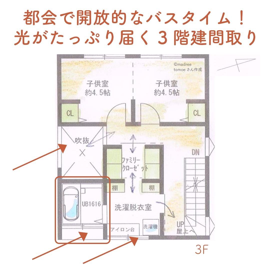 madree(マドリー)は、建築家さんの間取りを含むあなただけの家づくりマイホームプランをご提案しています。今回は「都会で開放的なバスタイム!光がたっぷり届く3階建間取り」をご紹介します。