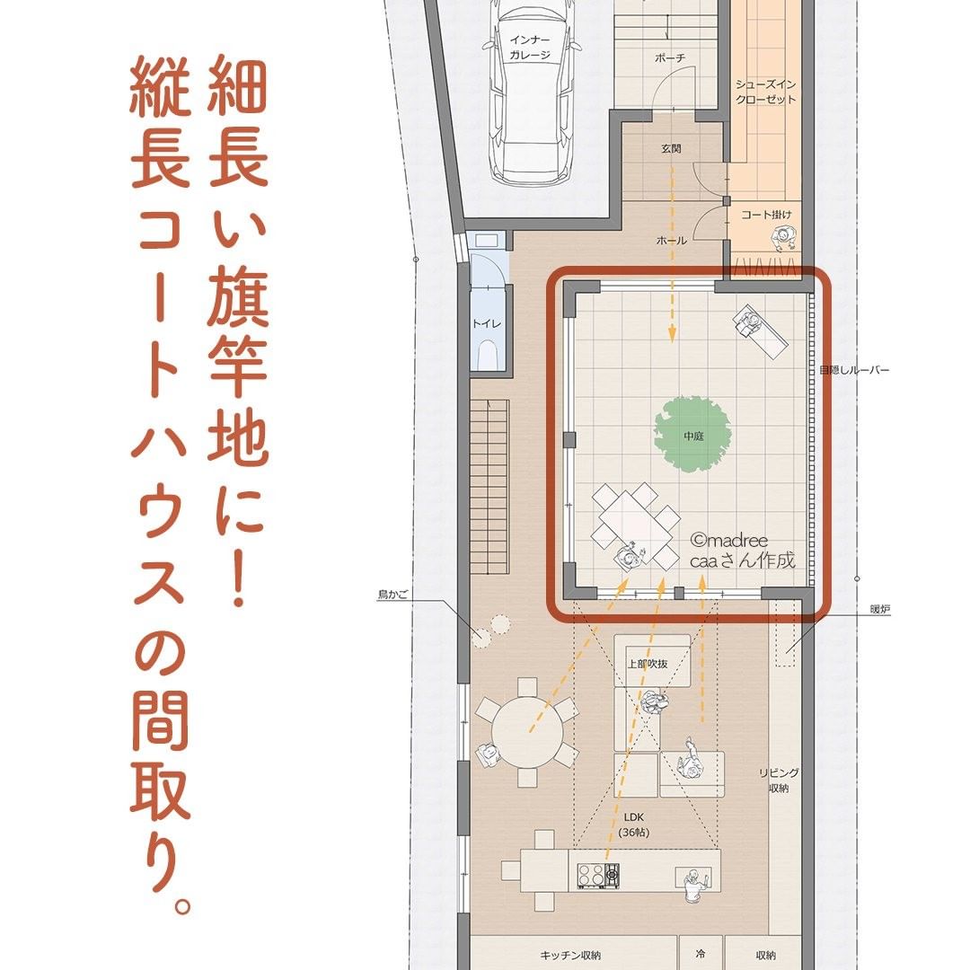 madree(マドリー)は、建築家さんの間取りを含むあなただけの家づくりマイホームプランをご提案しています。今回は「細長い旗竿地に!縦長コートハウスの間取り。」をご紹介します。