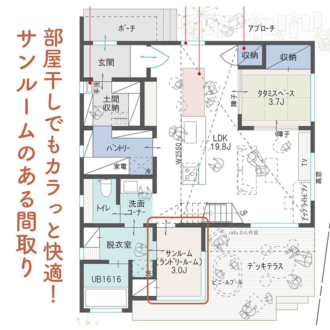 madree(マドリー)は、建築家さんの間取りを含むあなただけの家づくりマイホームプランをご提案しています。今回は「部屋干しでもカラッと快適!サンルームのある間取り」をご紹介します。