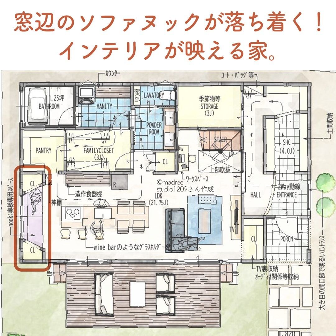 madree(マドリー)は、建築家さんの間取りを含むあなただけの家づくりマイホームプランをご提案しています。今回は「窓辺のソファヌックが落ち着く!インテリアが映える家。」をご紹介します。