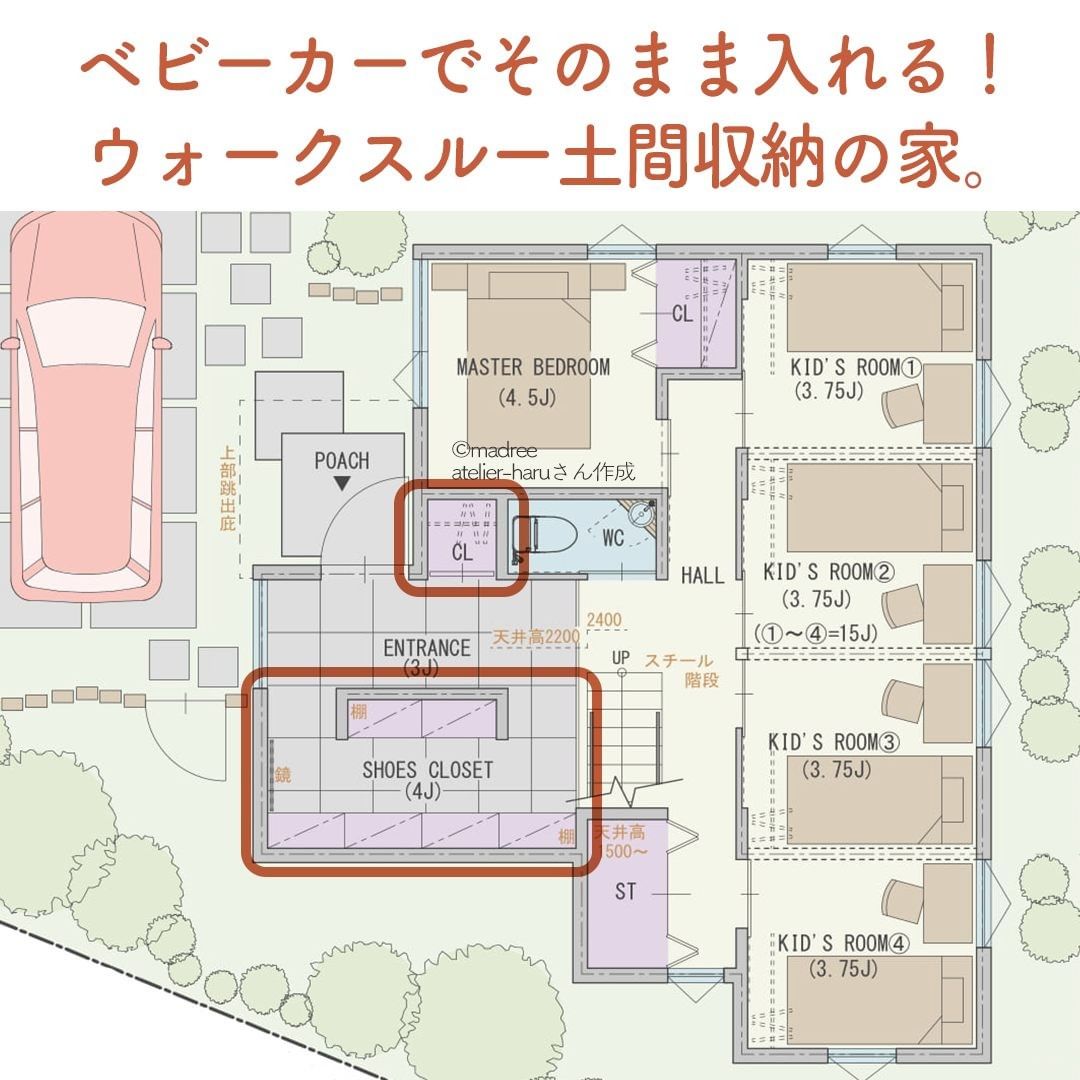 madree(マドリー)は、建築家さんの間取りを含むあなただけの家づくりマイホームプランをご提案しています。今回は「ベビーカーでそのまま入れる!ウォークスルー土間収納の家。」をご紹介します。