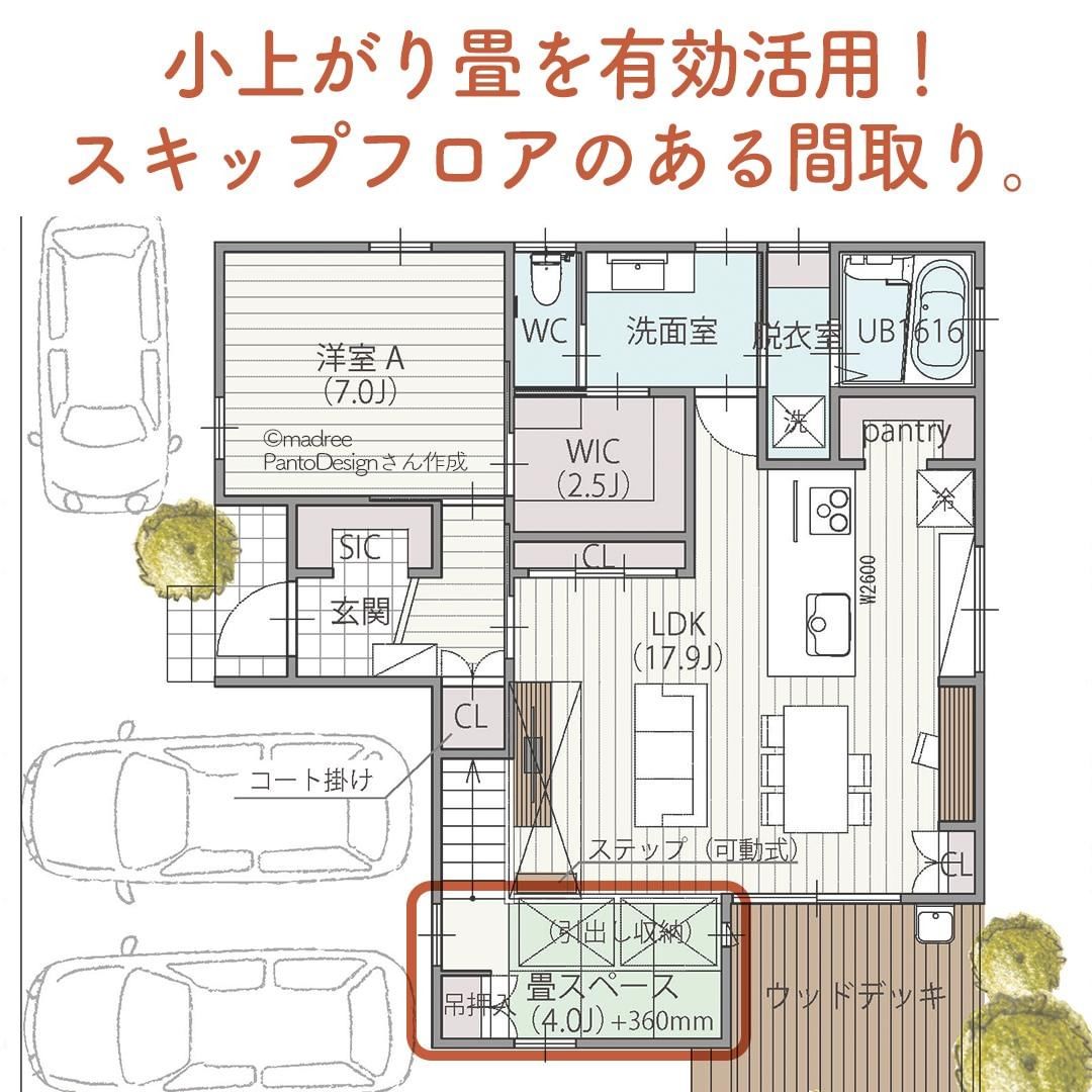 madree(マドリー)は、建築家さんの間取りを含むあなただけの家づくりマイホームプランをご提案しています。今回は「小上がり畳を有効活用!スキップフロアのある間取り。」をご紹介します。