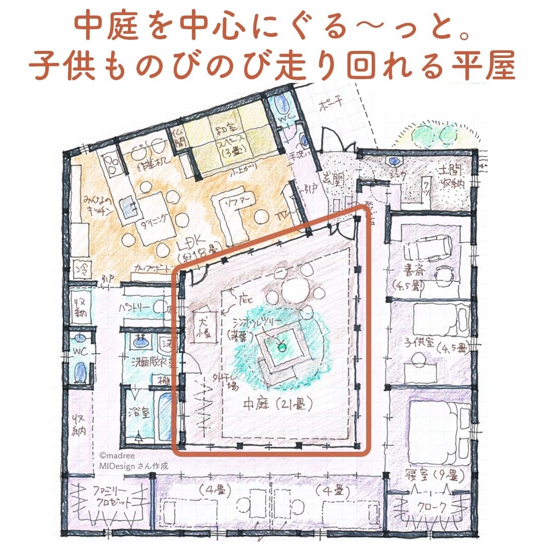 madree(マドリー)は、建築家さんの間取りを含むあなただけの家づくりマイホームプランをご提案しています。今回は「中庭を中心にぐる〜っと。子供ものびのび走り回れる平屋」をご紹介します。