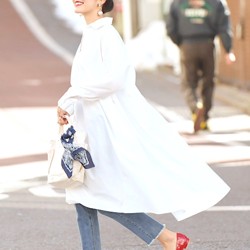 今季はビッグシルエットのシャツがトレンドです。体のラインを拾わないので、自然と体型カバーが叶うのも特徴的です。襟抜きや袖をまくるなど、女性らしい着こなしを意識するのがおすすめ。カラー展開も豊富なので、色によって雰囲気の違いを楽しめます。