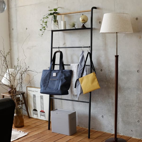 壁に穴を開けずに設置できて、立てかけるだけでOKのラダーハンガーが人気です。どこでも気軽に取り入れられますし、省スペースで設置できますよ。ラダーハンガーは雑貨を飾ったり服をかけたりできる優秀なアイテムなので、ぜひ迎え入れましょう!
