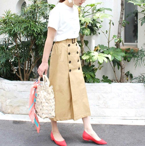 今春のスカートはバラエティに富んでいますよね。今回はフロントにボタンが施されたタイプに注目致しました。大人の素敵なコーディネートを、ぜひご覧ください。