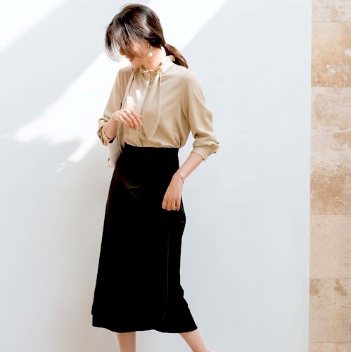 春のオフィススタイルで活躍してくれるアイテムといえば、やはりブラウスですよね。 女性らしくキレイめな着こなしが簡単に実現するのが嬉しいポイント。 ブラウスのカラーに迷ったときは、オールラウンダーなブラックをセレクトしてみてはいかがでしょうか。
