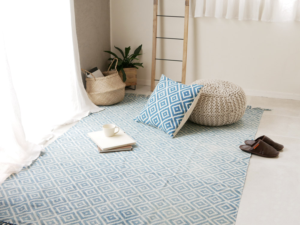 世界的なラグの産地インドから!丁寧に織り上げられた綿100%ならではの心地よい質感が魅力のラグマットが届きました。 夏はさらりと気持ちよく、冬は底冷えを軽減し一年中快適に使えるラグマット。 インド独自の個性的な柄と絶妙なカラーが魅力で、敷くだけでお部屋の印象をがらりと変えることができます。
