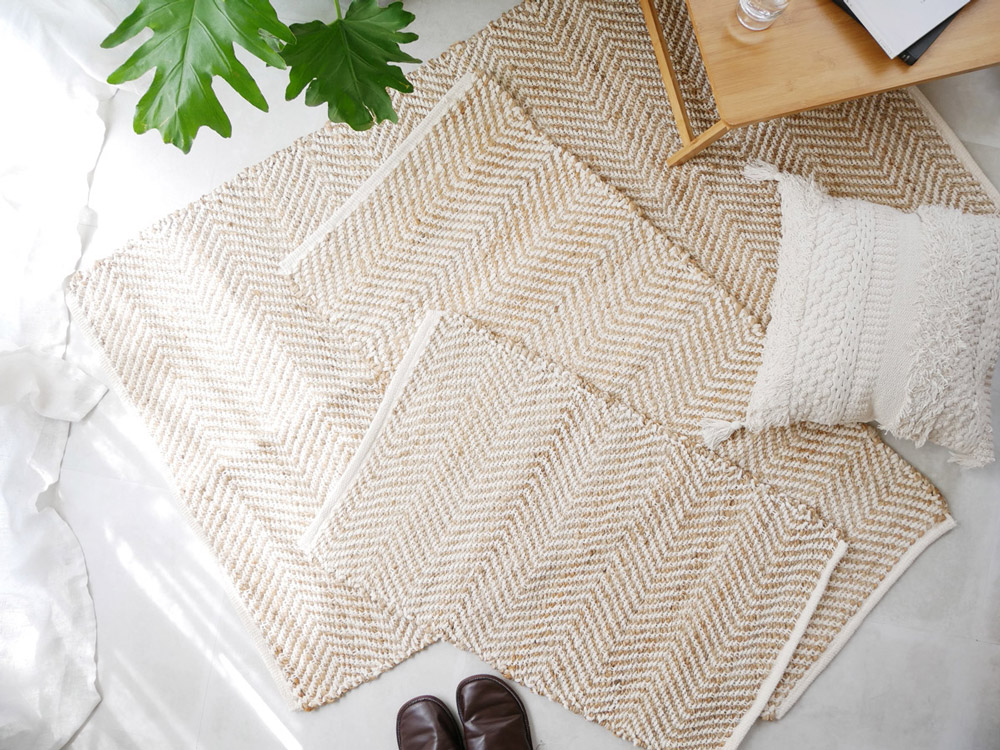 耐久性に優れたジュートと踏み心地のよい綿生地をミックスさせ編みこんだ、ヘリンボーン柄がお洒落なフロアマットです。 過ごしやすく快適な空間にしてくれるのと同時に、デザイン次第ではお部屋の雰囲気を左右するフロアマットです。