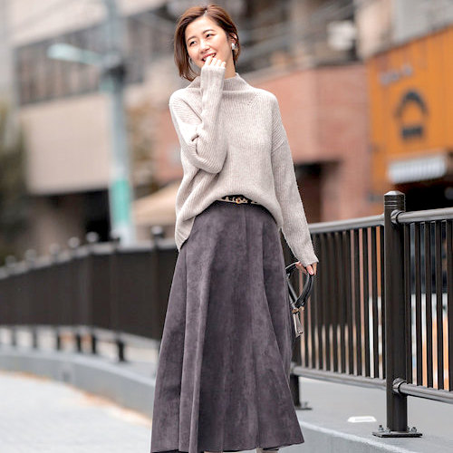 秋冬アイテムの定番といえばニットや、コーデュロイ、ベロアなど色々ありますが、なかでも今回はスエードに注目してみたいと思います。フェイクスエードのスカートは、エレガントで上品な印象を与えてくれるので、大人女子のマストハブアイテムのひとつです。では早速、スカート派さんの秋冬マストアイテムのレディコーデをチェックしましょう!