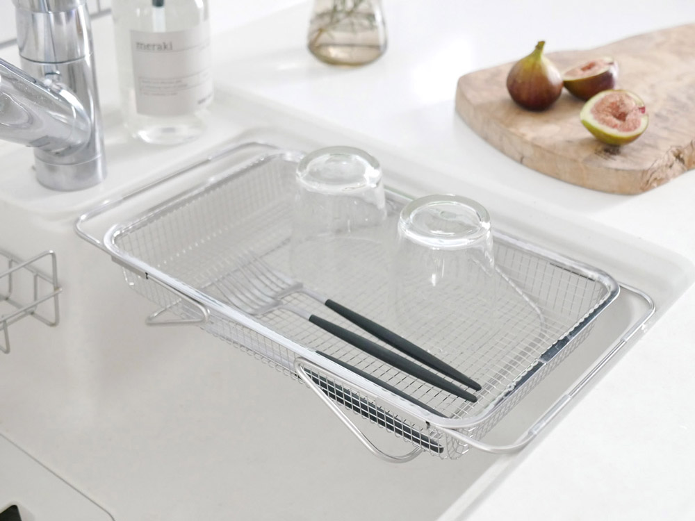 シンクの中でも外でもサッと移動できる水切りカゴ。網なのでパッキンなどの小さい物も落ちず、自立できるスタンド形状で収納時も省スペースでOK!安心の日本製、18-8ステンレス製の水切りカゴです。