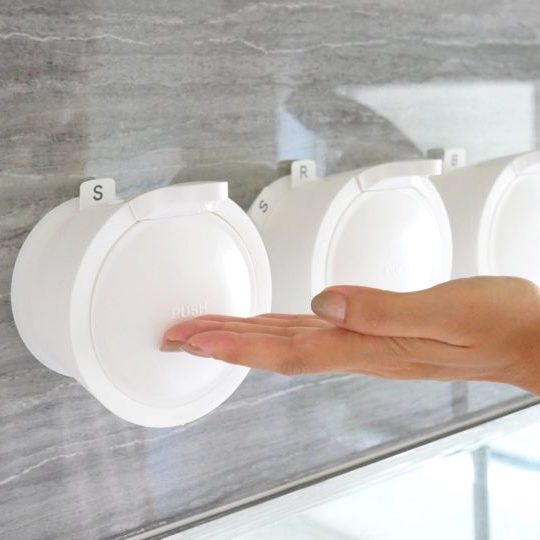 真ん中のぷっくり部分を片手でPUSH。使う分だけでる「ソープディスペンサー」でバスルームで場所をとっているシャンプー類をスッキリと自分好みに壁にレイアウトできちゃいます。