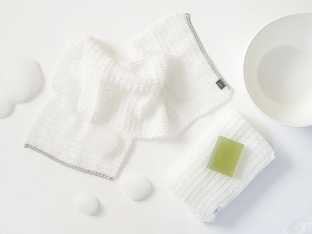表地と裏地でふわふわの泡とシャリッと硬いさっぱり感を同時に味わえるボディウォッシュタオル。白いタオルにさり気ないステッチとタグの色使いもオシャレ。