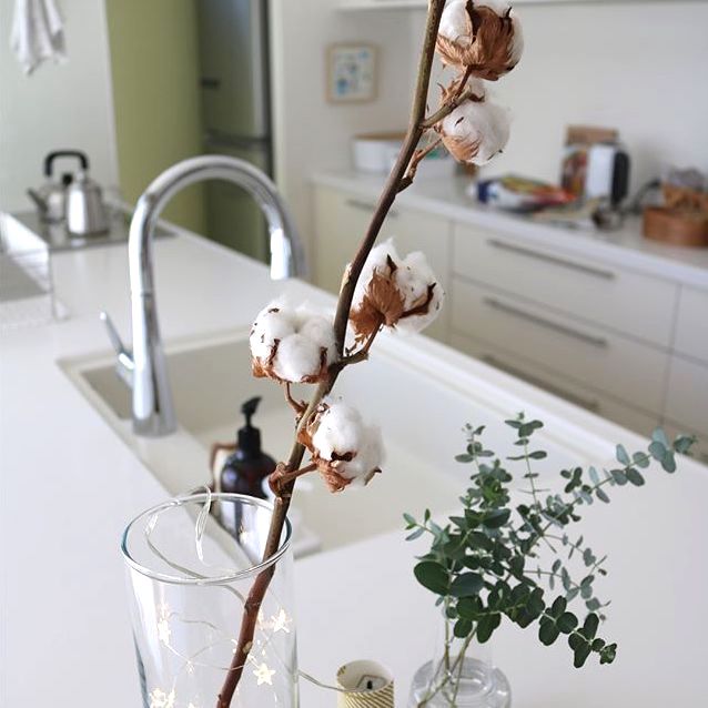 衣類などの原料になるコットンが枝についた状態の「コットンフラワー」を、お部屋に飾る人も多くなりました。実からあのふんわりしたコットンになるのは9月~11月の間。このためお部屋に飾ると、秋冬を連想するような落ち着いた雰囲気を作りやすいです。そこでこの記事では、コットンフラワーを用いたインテリアをまとめていきます。